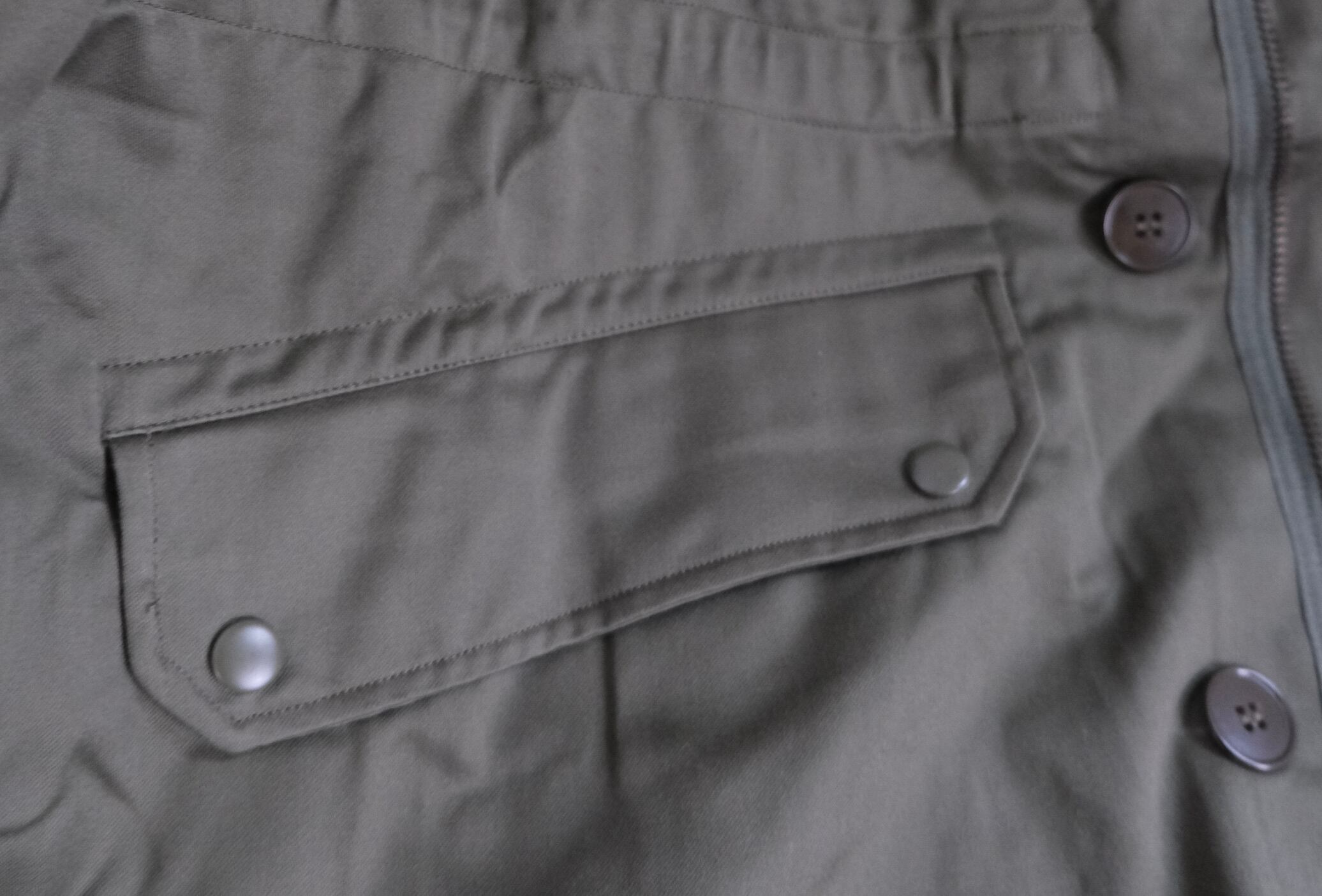 フロントは、ジッパーとボタンの併用式で、正面に大型フラップ付ポケット2個。